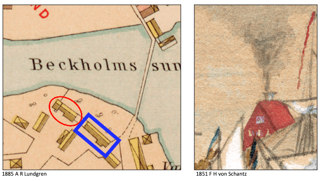 Av kartbilden ovan (A R Lundgren, 1885) framgår det klart att om en ångsåg eller ett ångdrivet (kanske mobilt) pålningsaggregat vore placerat på landbacken nere vid det kommande brofästet på Beckholmen, så skulle det ha legat i exakt rätt riktning från den punkt på sydöstra Kastellholmsstranden där von Schantz befann sig när han skissade denna del av sin lilla tavla (någonstans mellan den röda och svarta cirkeln). Den kraftiga rökpuff han avbildade synes ju emanera från en plats rakt bakom – och bortom – det då nyuppförda Boningshuset högst uppe på höjden längst norrut på Beckholmen (i ljusblå ellips). Själva eldhärden eller ångmaskinen nere vid brofästet skulle naturligtvis ha varit helt skymd för honom, men riktningen är helt korrekt.